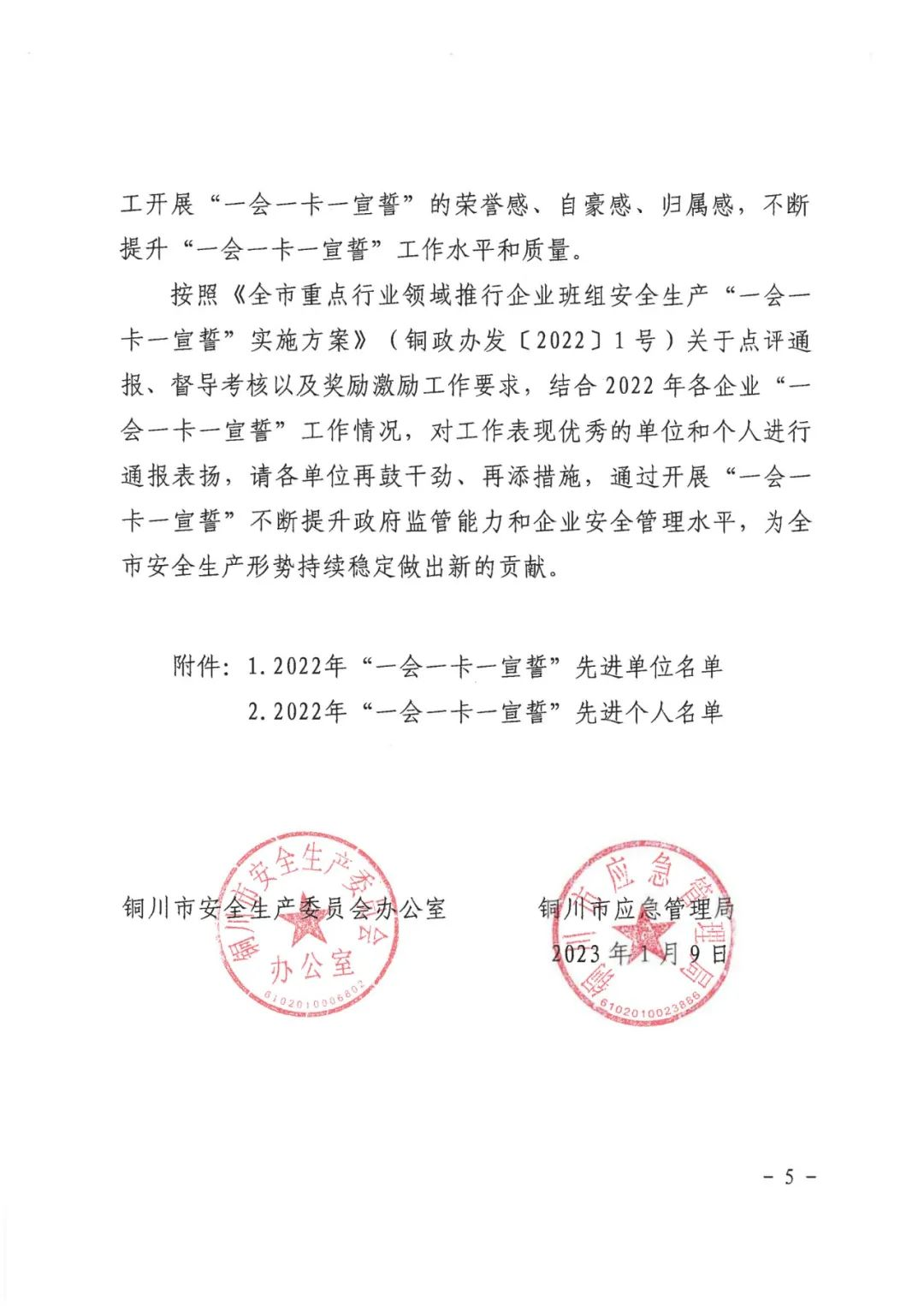 近日,銅川市安全生產(chǎn)委員會(huì)辦公室、銅川市應(yīng)急管理局聯(lián)合發(fā)文,通報(bào)表彰企業(yè)安全生產(chǎn)“一會(huì)一卡一宣誓”工作先進(jìn)單位,陜建建材科技公司榮獲2022年度先進(jìn)單位。