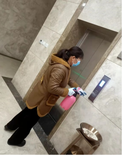 新型建材工作人員正在對(duì)辦公樓側(cè)門、電梯按鍵進(jìn)行消毒
